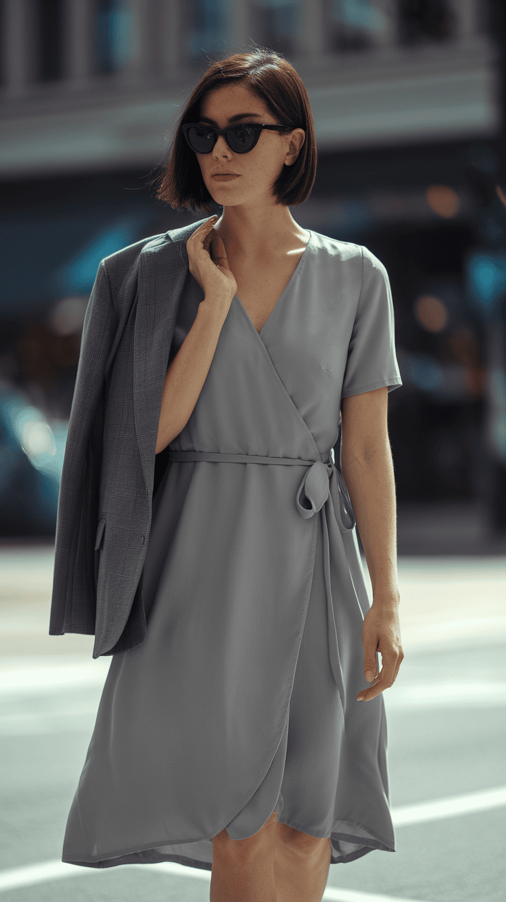 A light gray midi dress with a cinched waist belt is always a safe bet. It’s simple, stylish, and works for meetings or just another day at your desk.