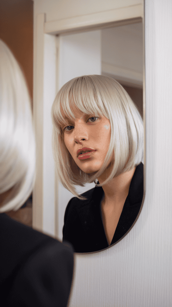 If you want hair that feels polished but not over the top, the glossy platinum bob is a strong choice. Its shiny finish makes your hair look healthy and cared for.