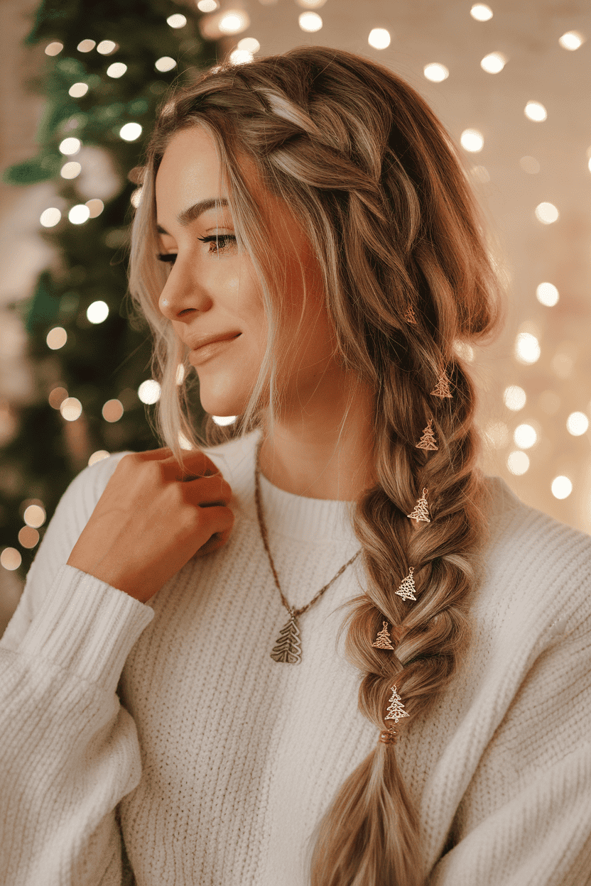 Try a simple braid and decorate it with tiny Christmas tree charms. These little details make your hair pop without going overboard.