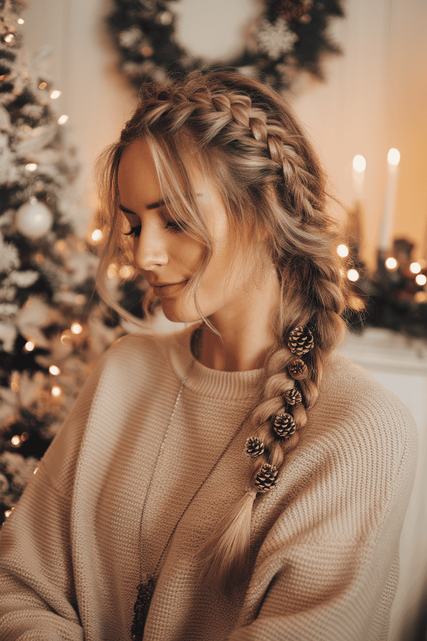 Braid your hair loosely so the texture stands out. Clip or tie pinecone decorations along the braid for a simple, charming holiday look.