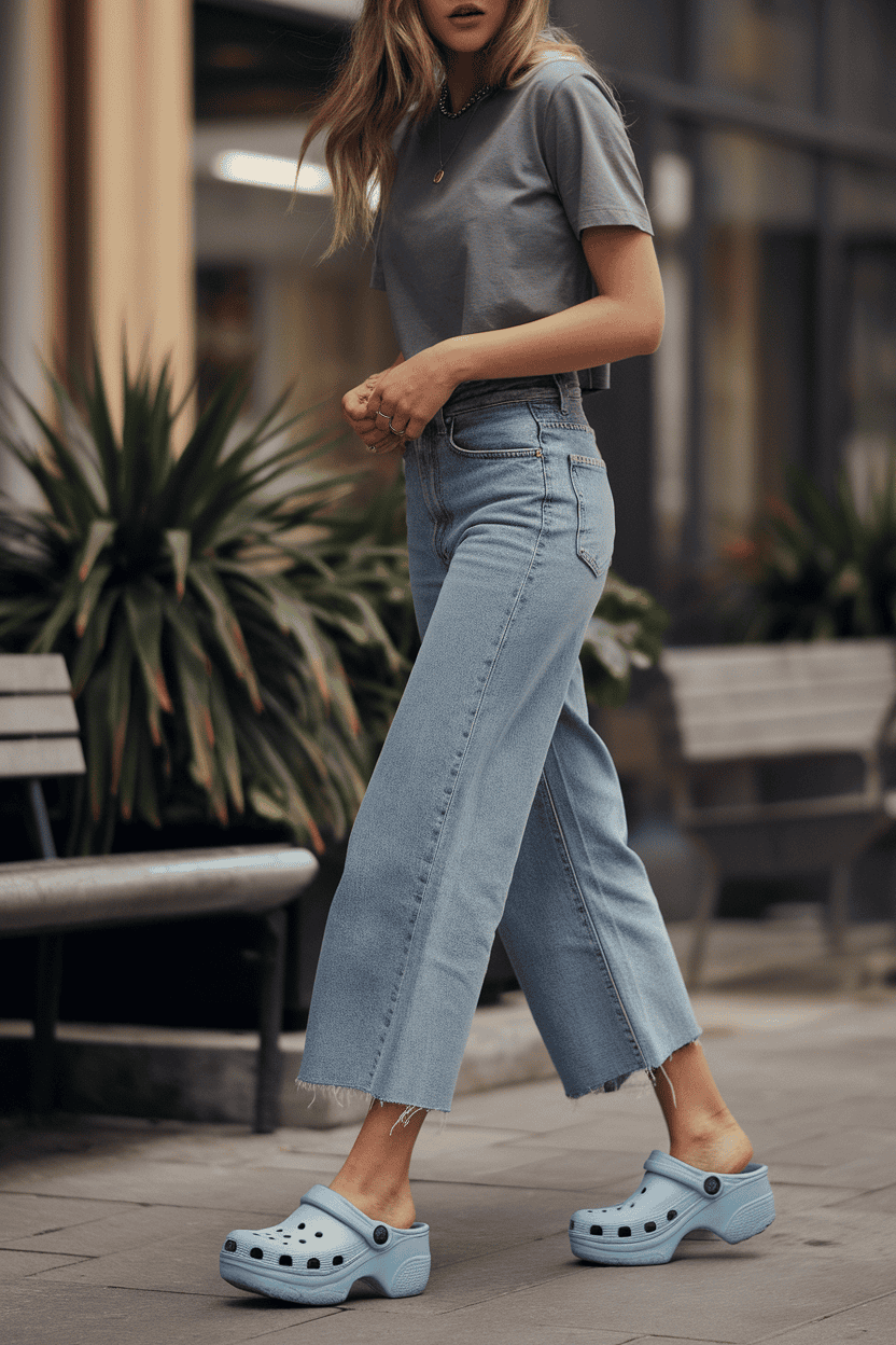 Throw on chunky platform Crocs with cropped wide-leg jeans for a cool, laid-back vibe. The cropped jeans let your Crocs take center stage and balance out those thick soles.