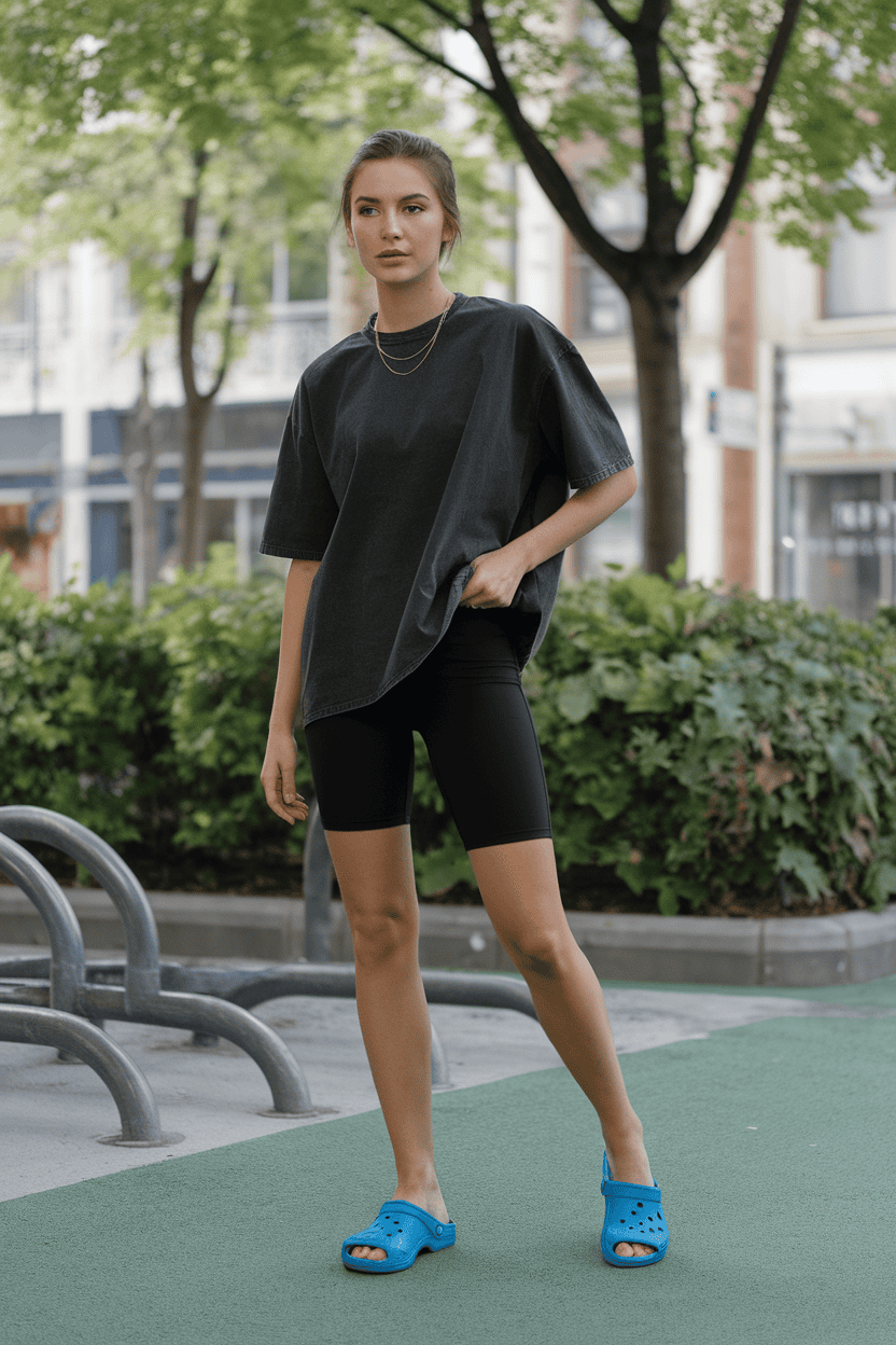Go for Crocs slides with bike shorts when you want to keep it simple and comfy. It’s a go-to for running errands or just a chill day out.
