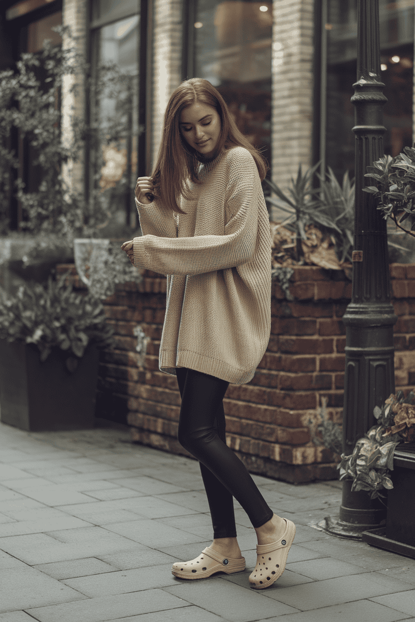 Neutral beige Crocs with a big, cozy knit sweater—you really can’t go wrong. This combo keeps things comfy and totally laid-back.
