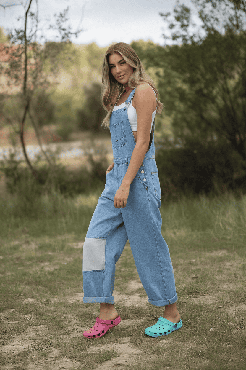 Make a statement with color-block Crocs and denim overalls. Those bold Crocs just bring a playful touch to the casual vibe of overalls.