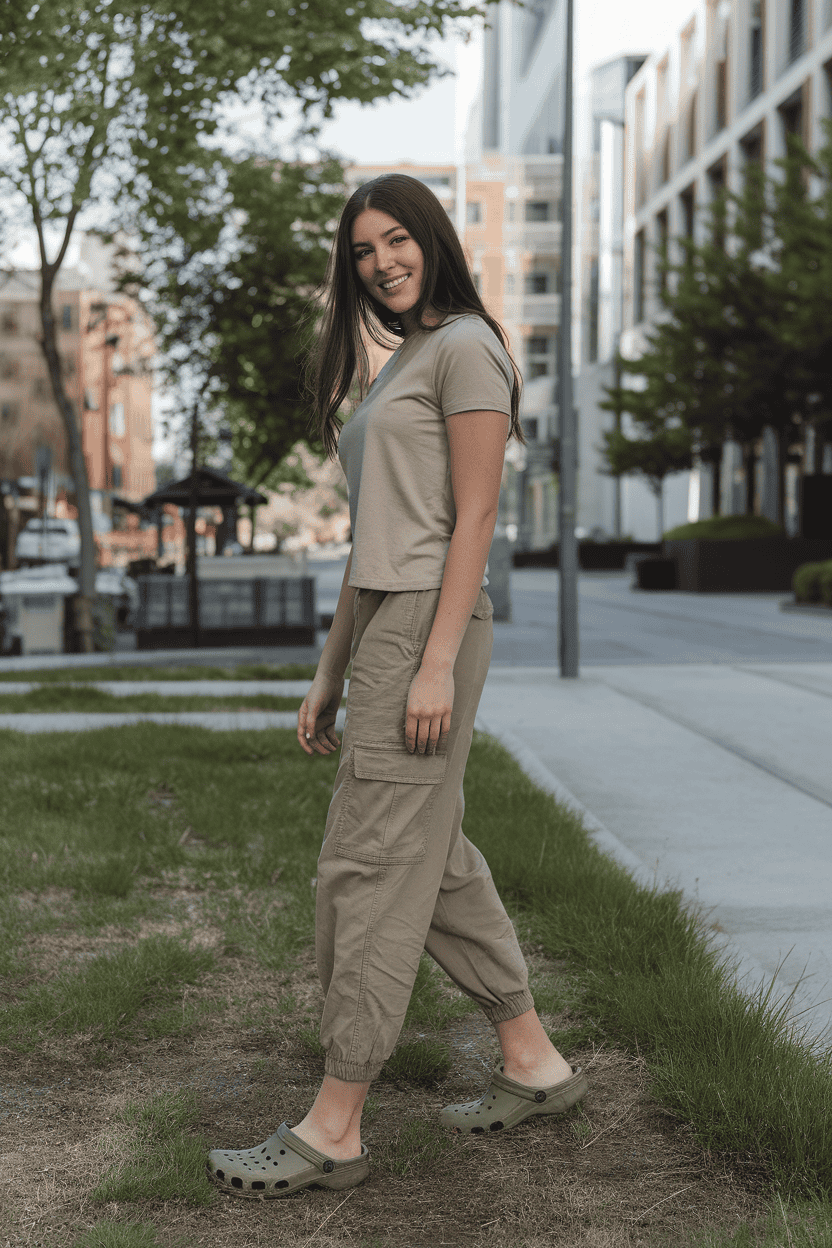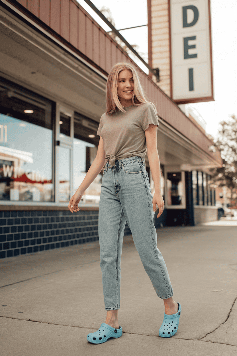 Pick a fun or neutral Crocs color. This outfit feels light and effortless, perfect for errands or casual meetups.