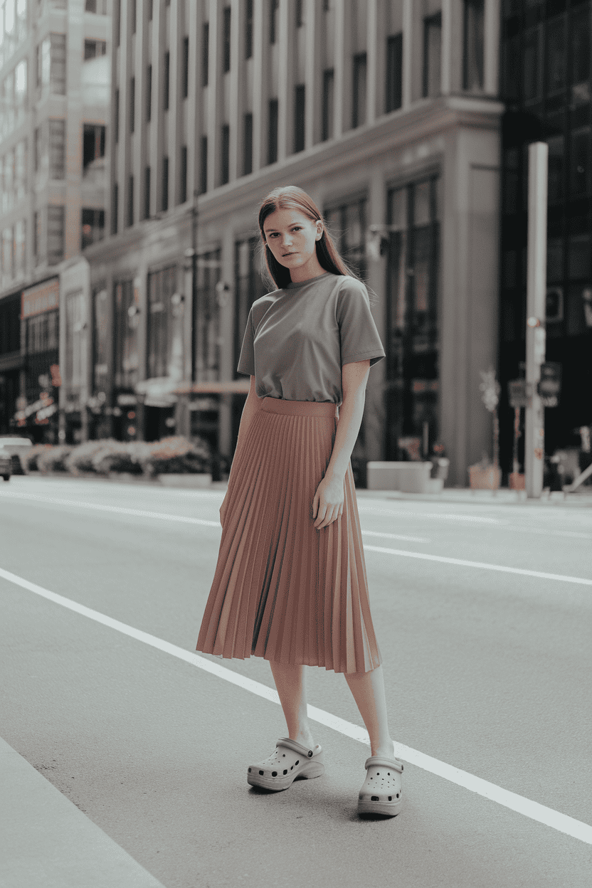 Try platform Crocs with a pleated skirt for a fun, fresh vibe. The chunky shoes give a cool contrast to the soft, flowy skirt.