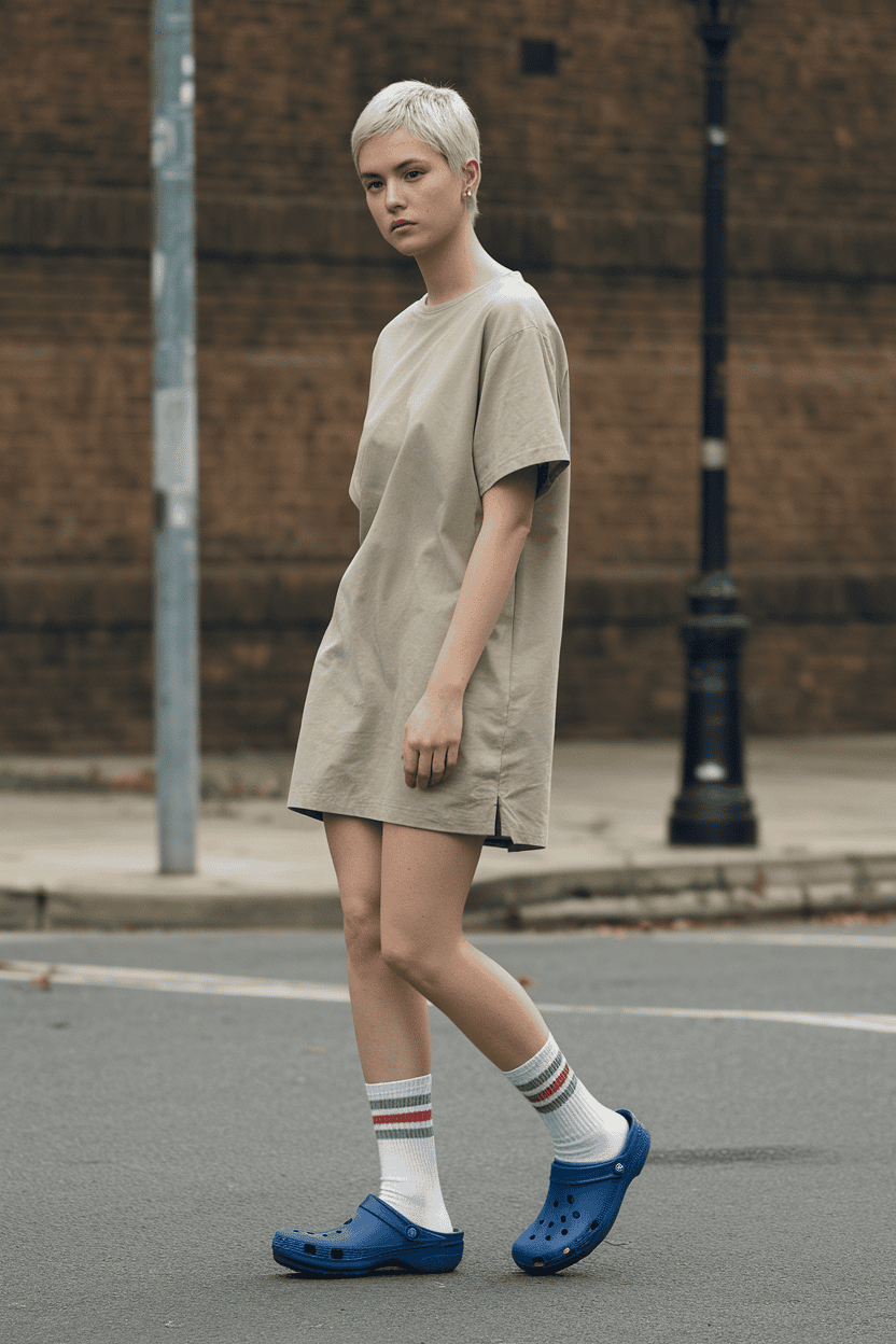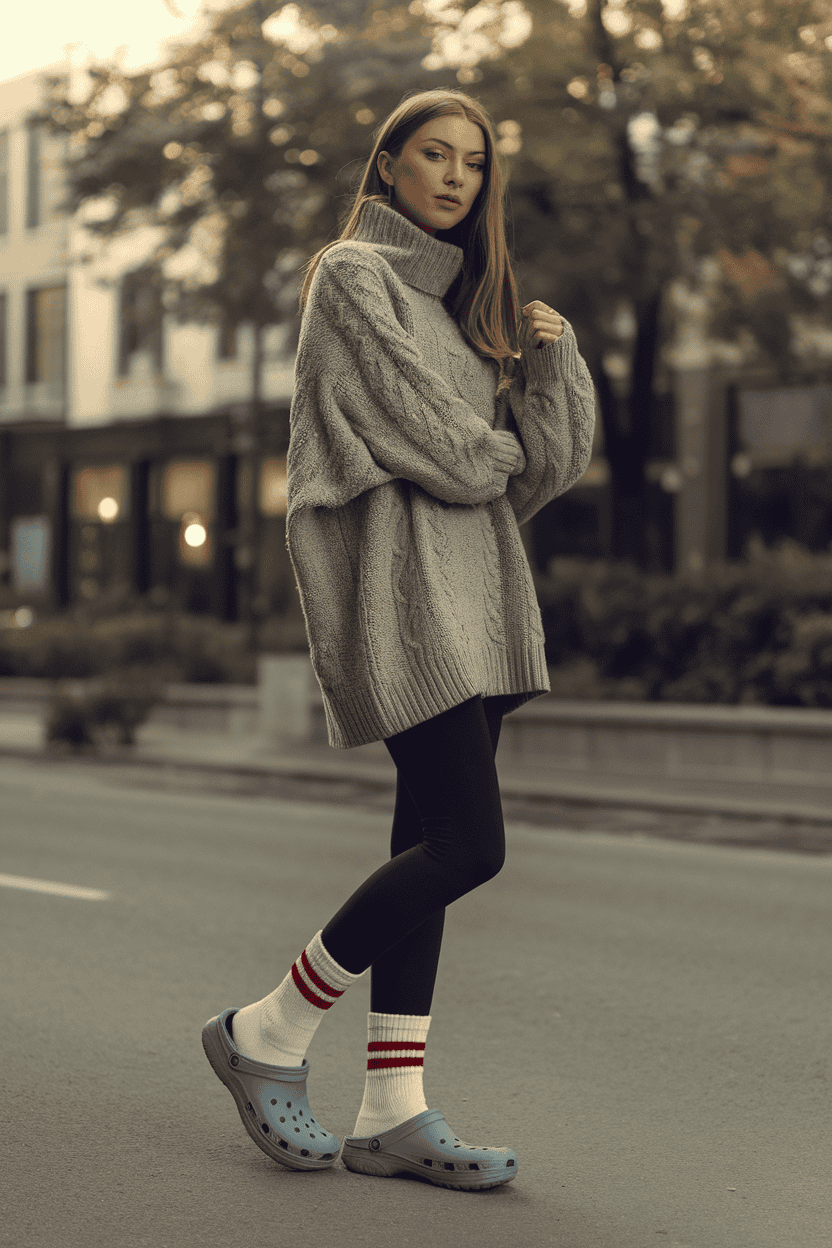 Pairing an oversized sweater dress with Crocs and socks? That’s cozy and cool at the same time. It’s honestly perfect for errands or just hanging out.