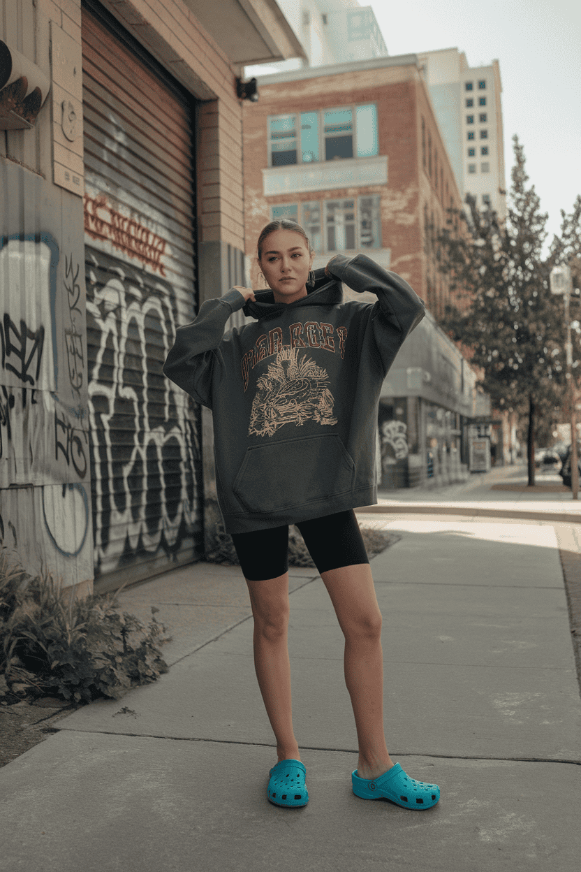 Throw on a graphic hoodie with bike shorts for a chill, easy look. It’s comfy and casual—perfect for running errands or just hanging out.