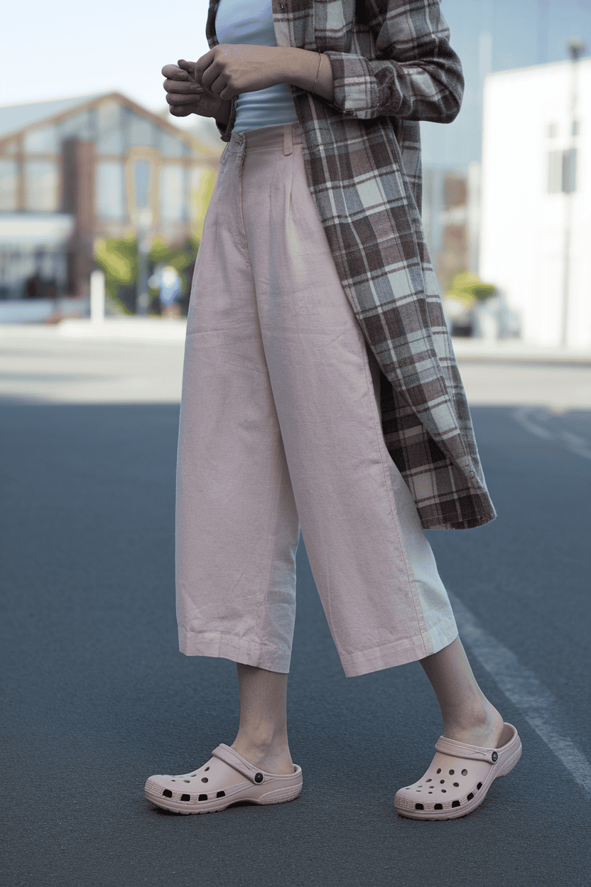 Keep it light with cropped linen pants and blush Crocs. That soft pink brings a laid-back vibe—honestly, it just feels fresh.