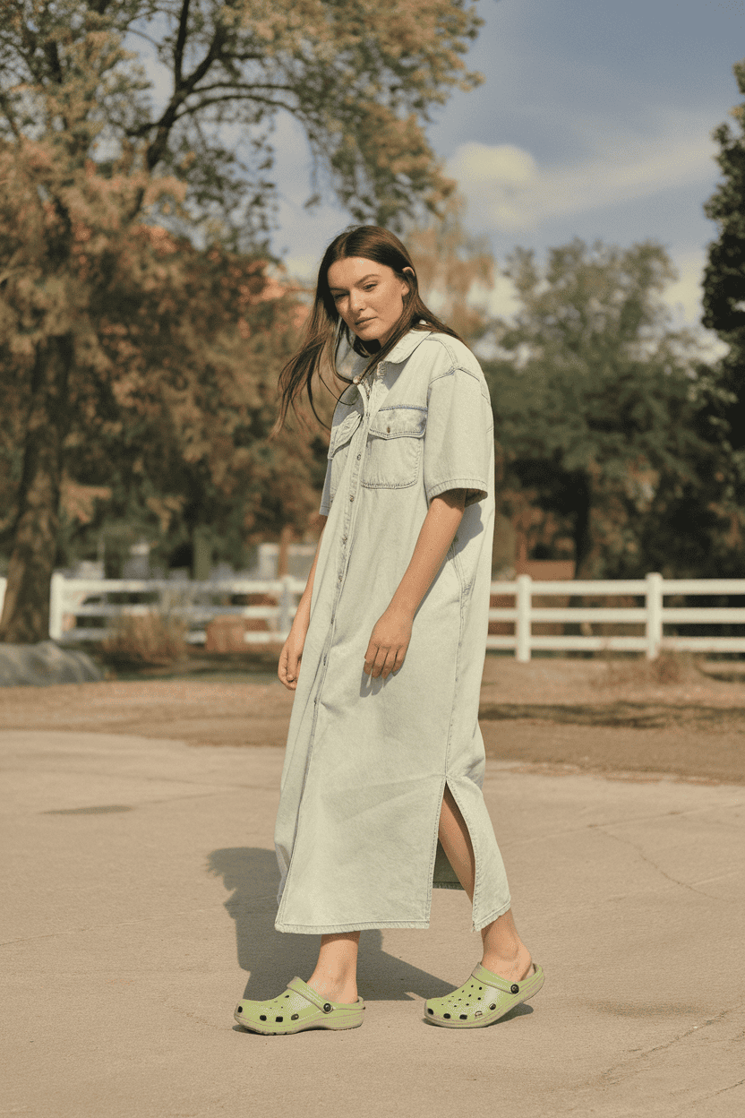 Pair a light wash denim dress with lime Crocs for a fresh, cheerful outfit. That pop of green just makes the whole thing feel more fun.