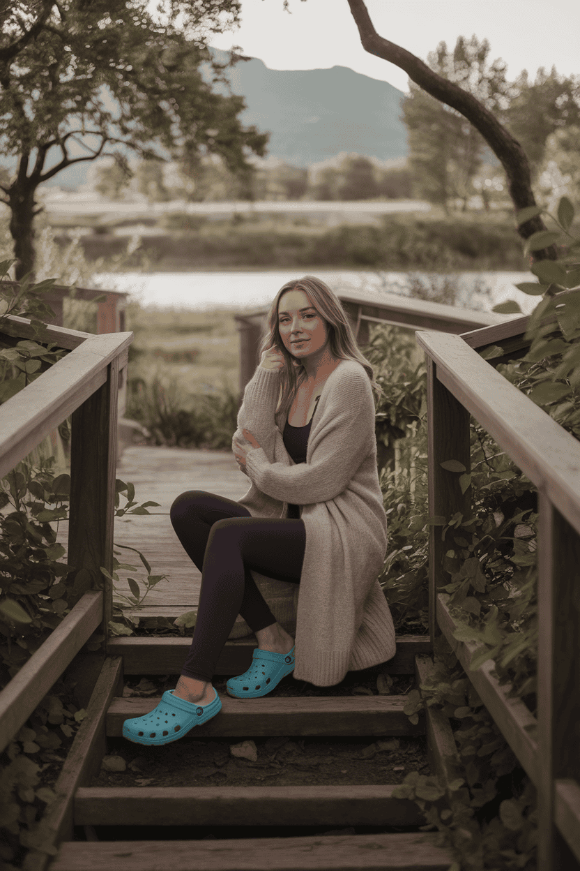 Toss on a soft knit cardigan with Crocs and leggings for instant coziness. The cardigan adds warmth but never feels bulky.