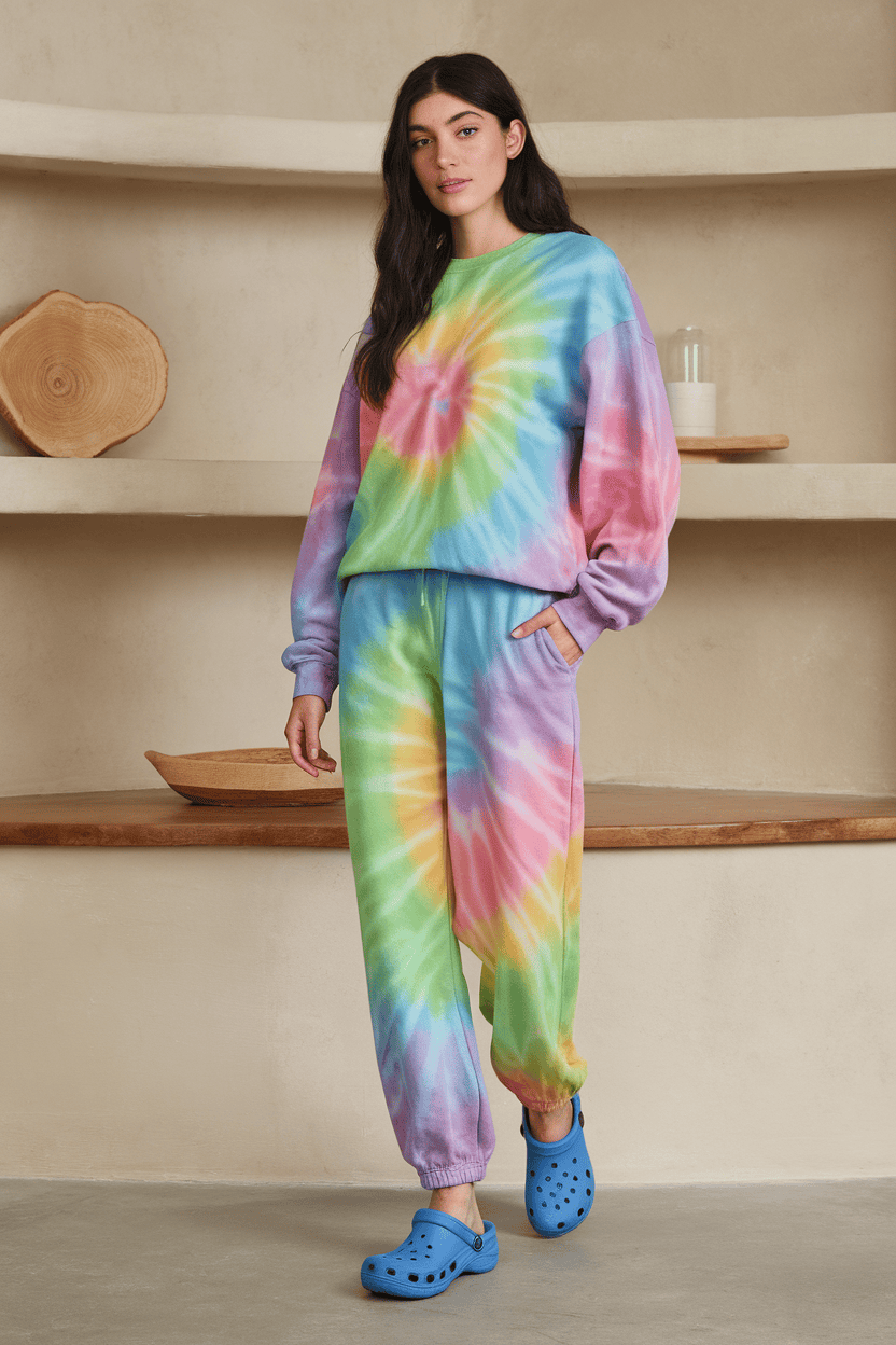 Try pairing Crocs with tie-dye sweatpants for a playful, easygoing look. The colors just work together.