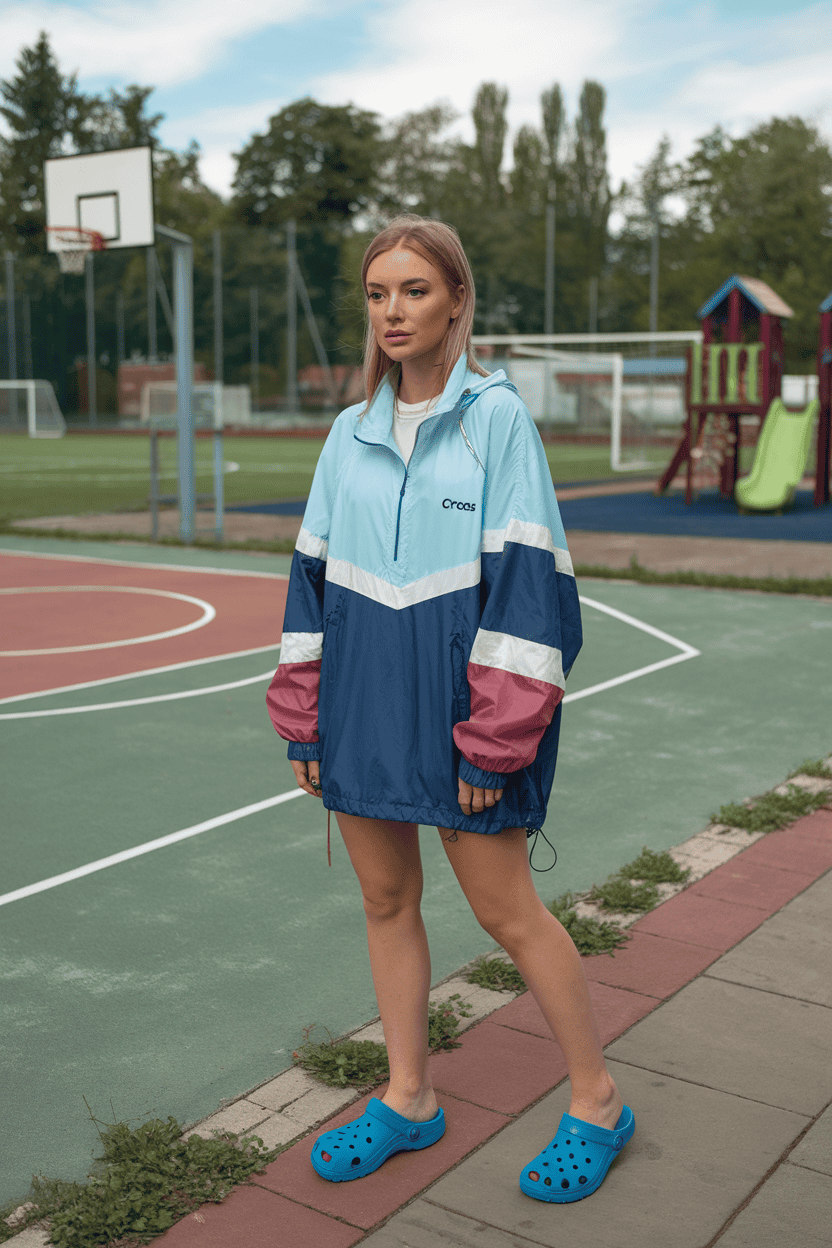 Pair a sporty windbreaker with Crocs sandals for a laid-back, on-the-go vibe. This combo is a lifesaver on cool days when you want something light.