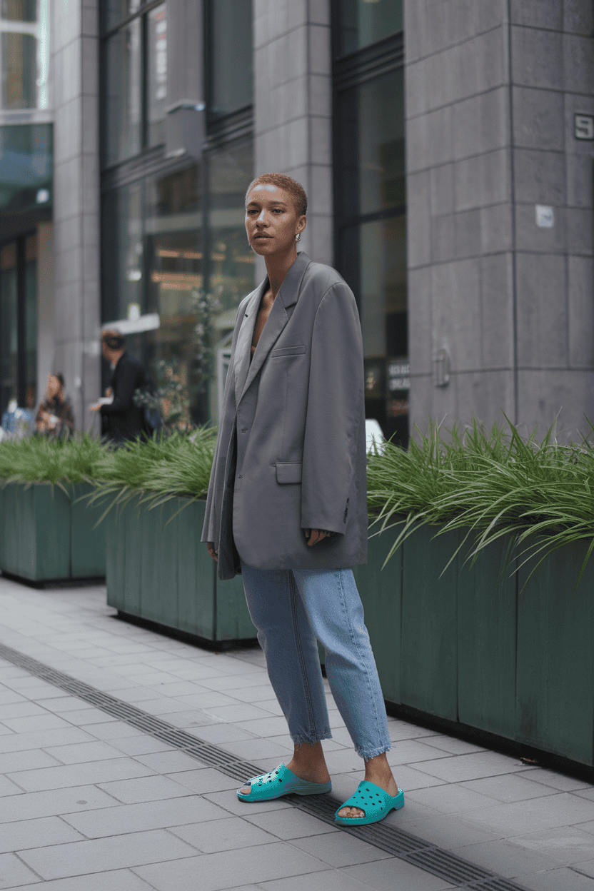 Throw an oversized blazer over Crocs slides and jeans for a relaxed, cool vibe. The loose blazer balances out the casual Crocs.
