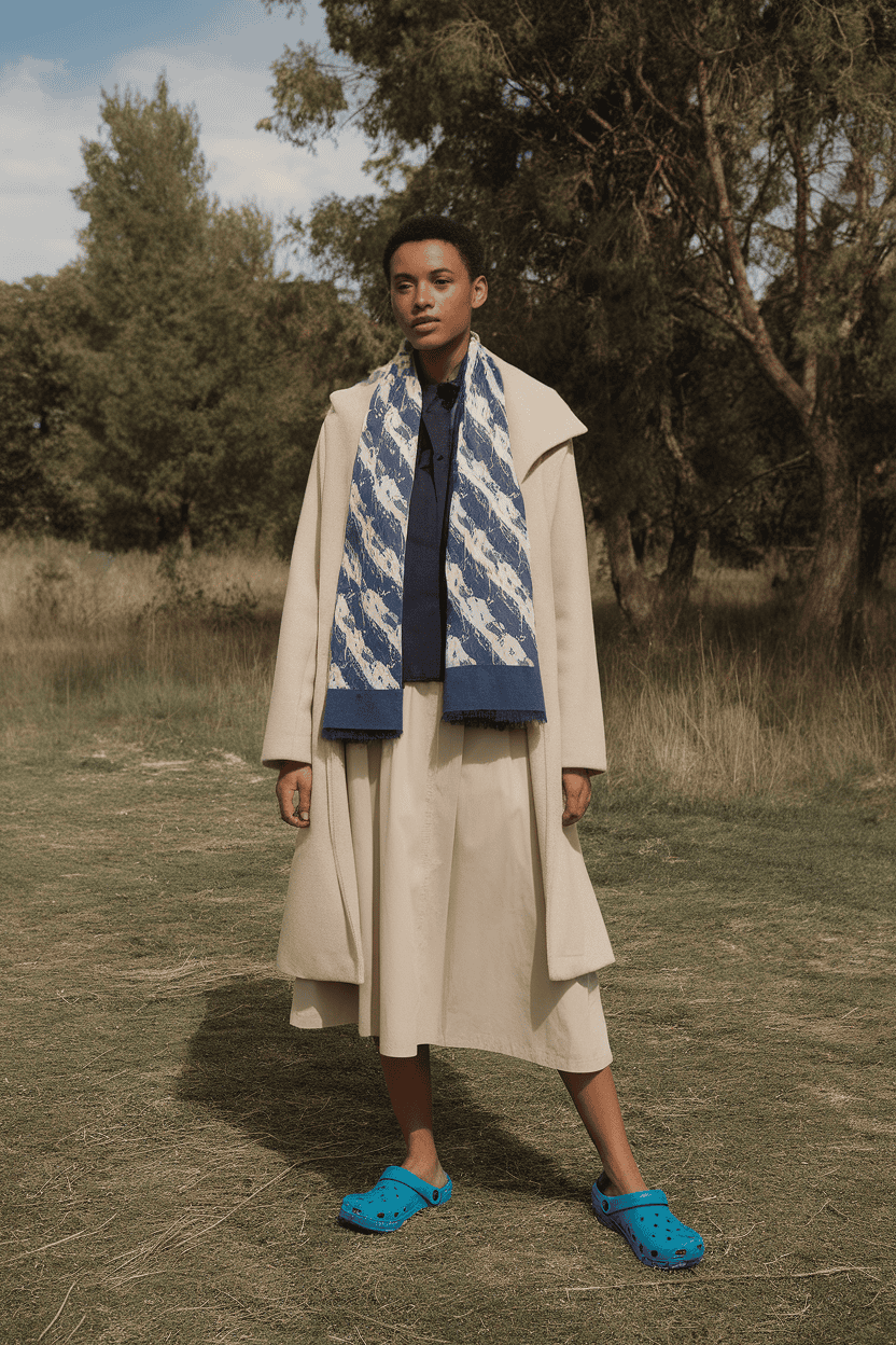 Add a scarf to boost your Crocs outfit. It brings color or pattern with barely any effort.