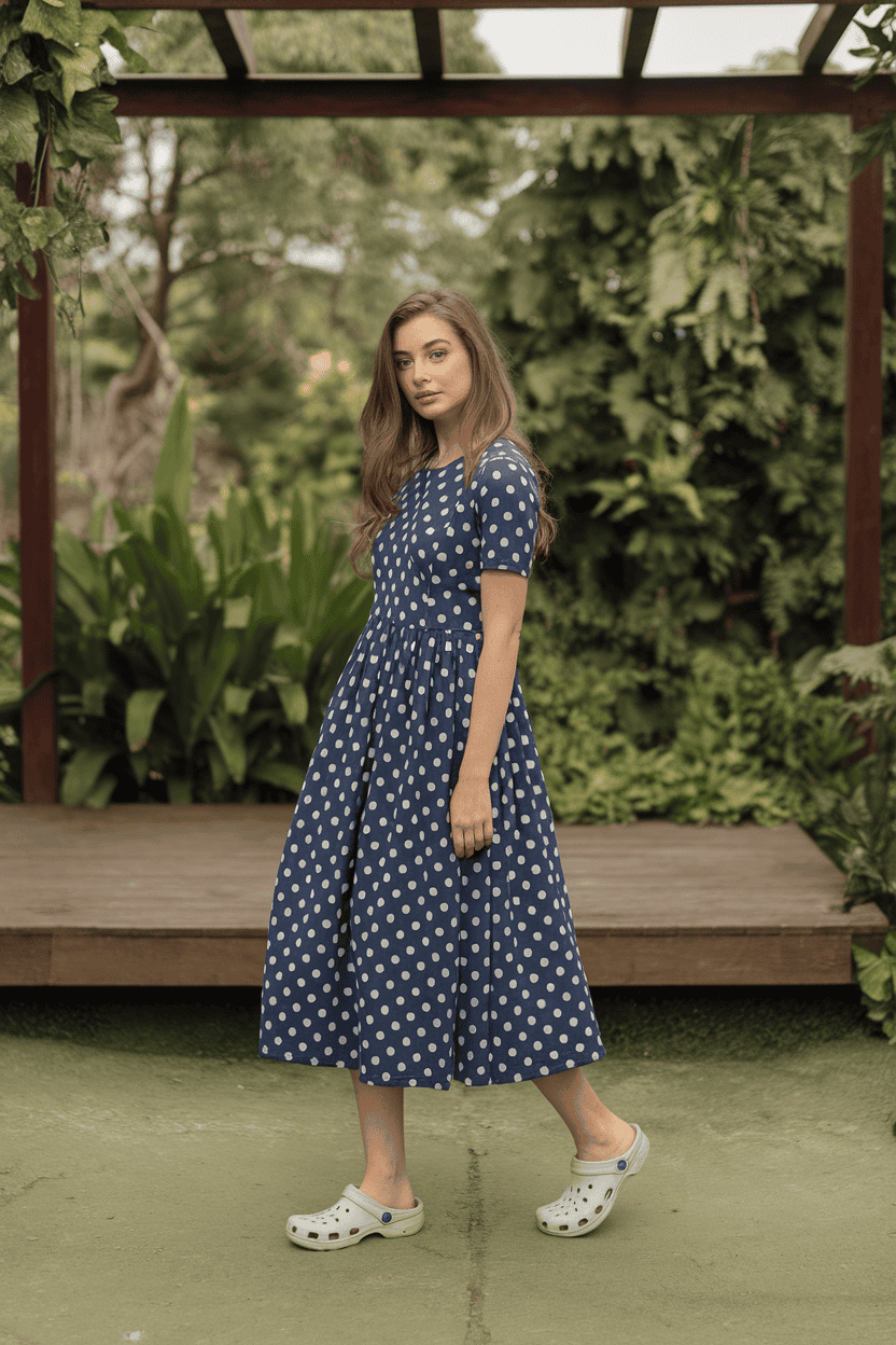Match a polka dot dress with pastel Crocs for a playful, fresh look. Soft Crocs colors work well with the dots.