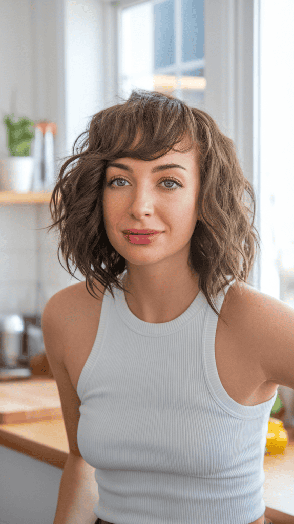 The fringe adds a playful touch and draws attention to your eyes. This style works with your natural curls, giving you a mix of texture and volume.