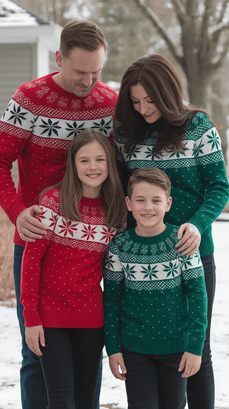 Fair Isle designs mix simple colors and shapes, perfect for holiday photos or casual gatherings. Look for options that fit everyone comfortably—from pullovers to cardigans.