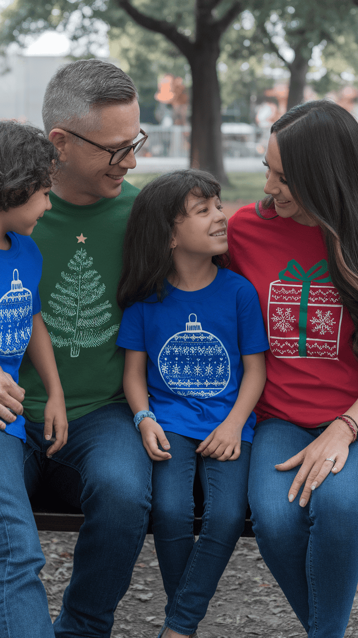 This style is easy to wear and comfortable. It’s a cool way to show off your family’s holiday spirit without much fuss.