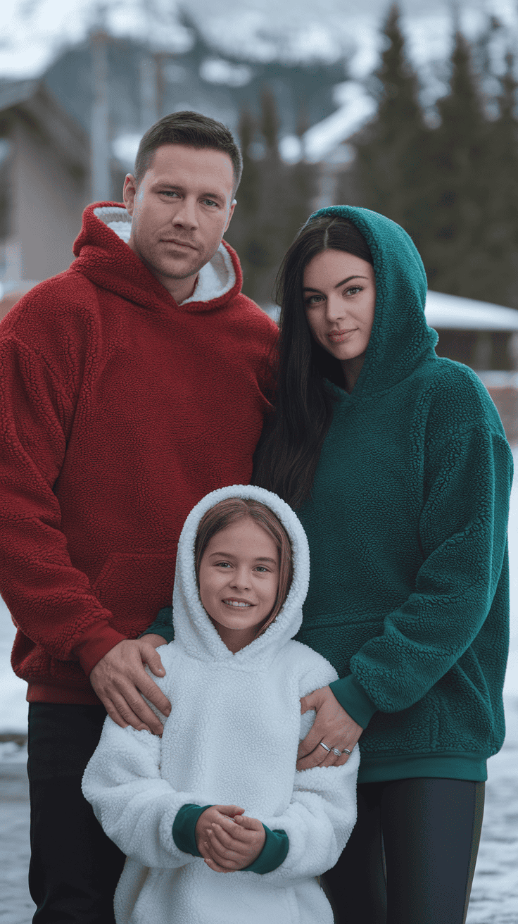 Keep your family warm and festive with sherpa-lined hoodies in Christmas colors like red, green, and white. These hoodies are soft inside and perfect for chilly days.