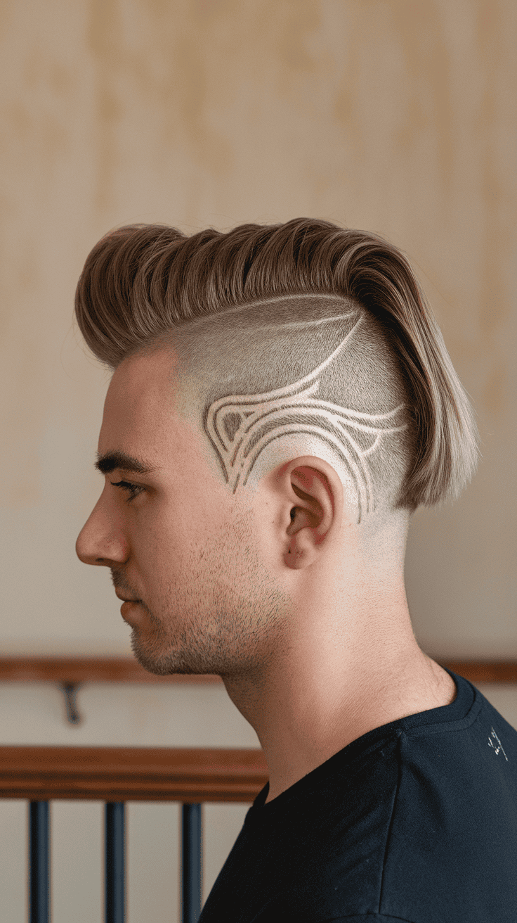 For a unique touch, try a fade mullet with shaved designs. You can go simple with lines or pick something more complex for the sides.