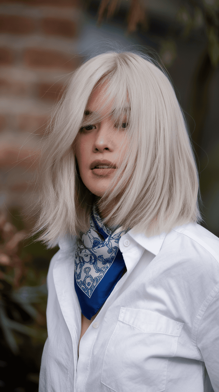 If you want to make a statement, try a long angled bob in platinum blonde. This color adds brightness and a modern twist to the classic cut.