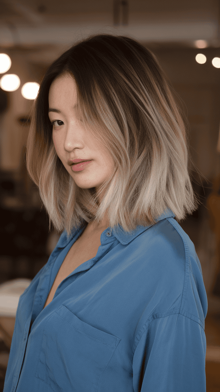 The soft ombre long angled bob is perfect if you want a gentle color fade that adds depth to your haircut. It blends darker roots into lighter ends, making your angled bob look more dynamic.