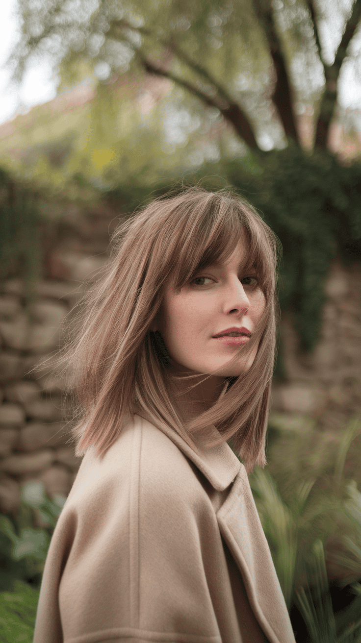 Soft layered bangs give a gentle touch to a long angled bob. They frame your face without feeling heavy or too blunt.