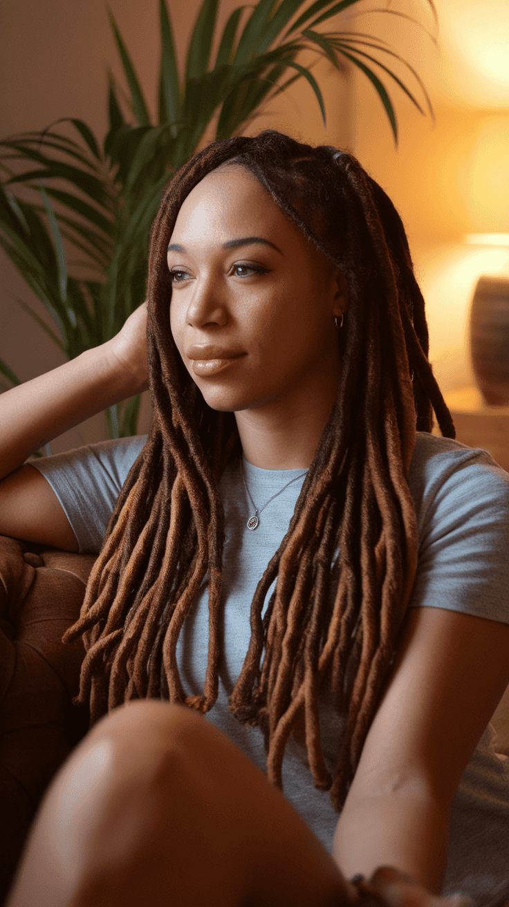 Add caramel tips to chestnut brown locs for a warm, fresh look. The deep brown keeps things grounded while caramel at the ends adds a soft, glowy finish.