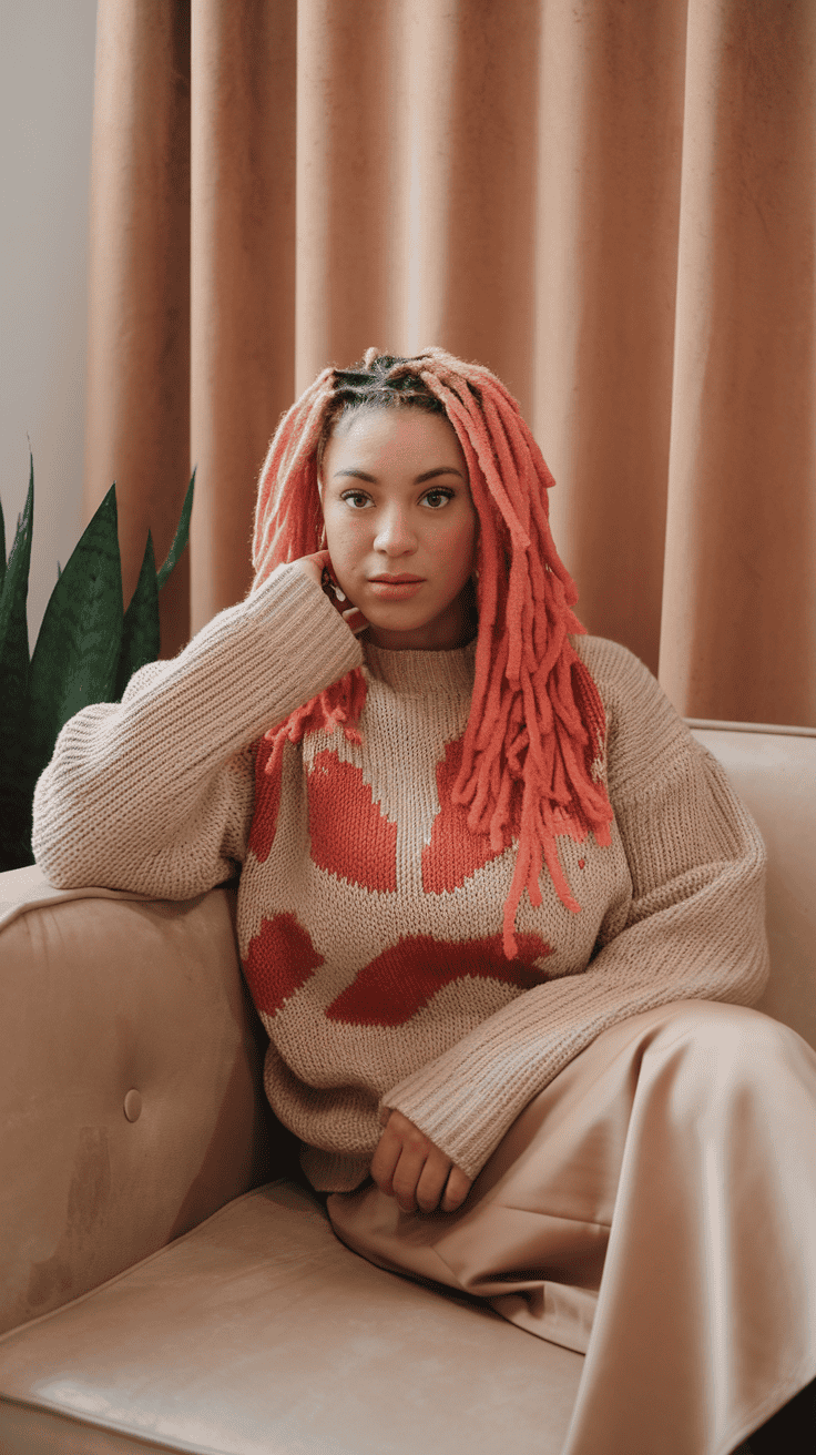 Soft peachy coral locs bring a gentle, playful vibe. The color mixes pink and orange for a subtle, summery glow.