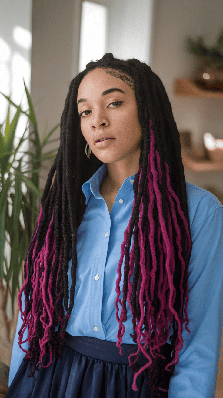 Magenta highlights on black locs? That’s a fun way to make your style pop. The contrast is bold, but you don’t have to commit to a full head—just a few bright strands can totally change your look.