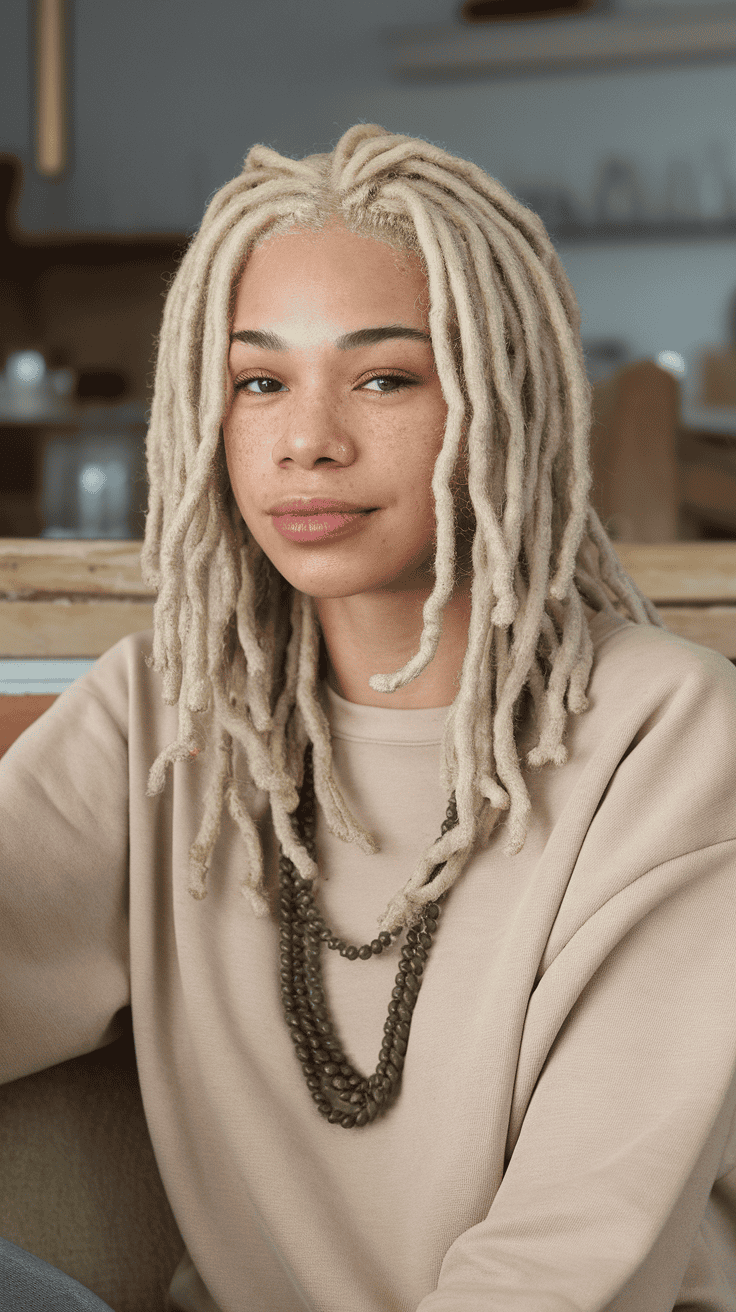 Feeling bold? Icy platinum blonde locs stand out with their almost-white brightness. It’s a modern edge that doesn’t feel too loud.