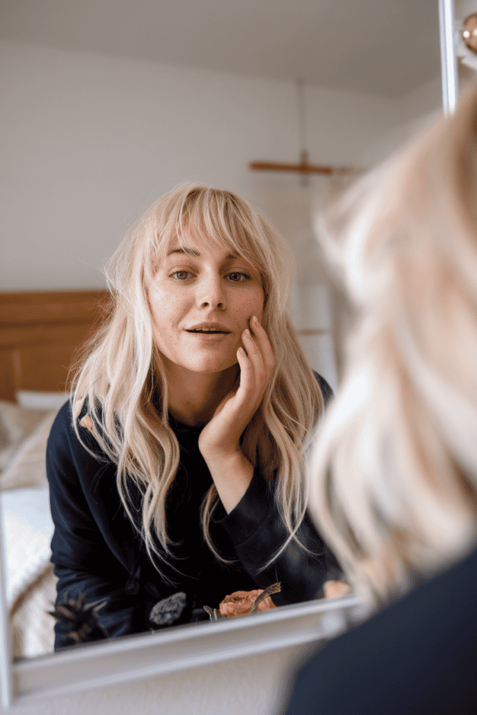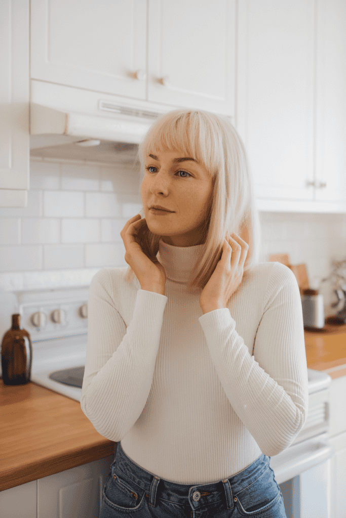 A woman with long messy hair standing in a casual indoor setting, wearing a simple sweater and looking relaxed and natural.