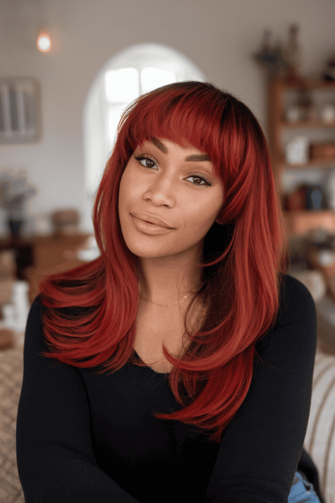 The bangs blend with the layers and add a soft touch. This style works best for longer hair, giving you a natural flow that’s got a hint of edge.
