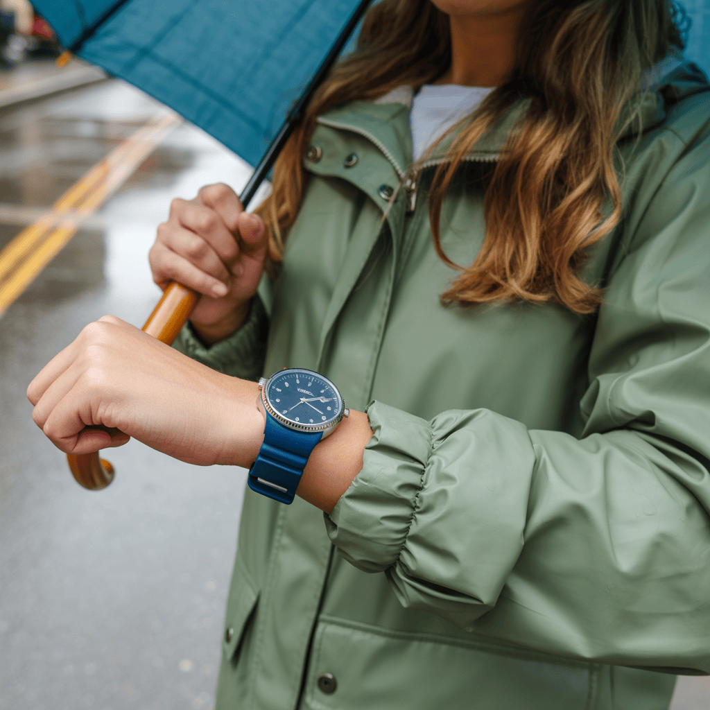 Pick a watch that can handle spring showers. A waterproof watch with a rubber strap is a solid choice—the strap dries fast and stays comfy, even when wet.