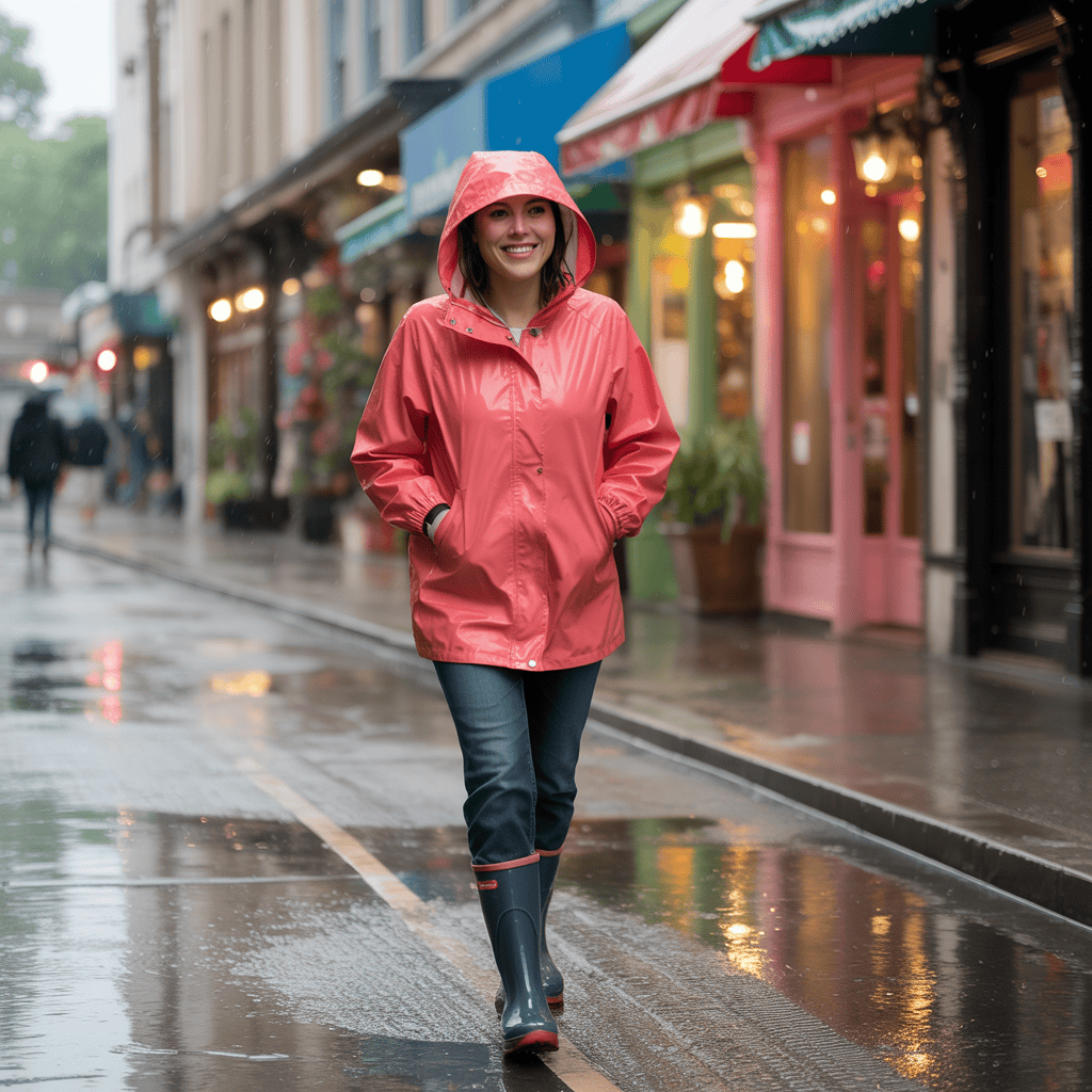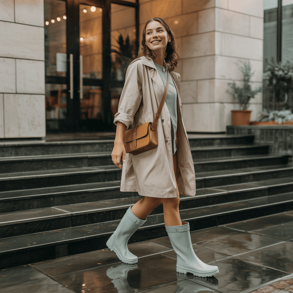 Pastels or soft florals can really brighten up a rainy day and keep things looking fresh. Rain boots or waterproof shoes keep your feet dry and add a trendy touch—pick boots with fun patterns or bright colors if you’re feeling bold.
