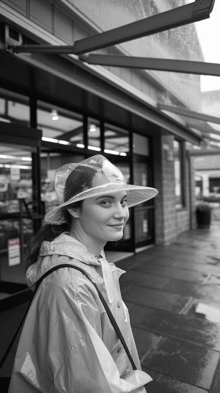 You’ll love how a clear vinyl rain hat keeps your hair dry without hiding your style. It’s lightweight and easy to carry on rainy days.