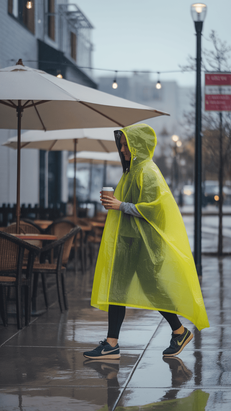 You can’t go wrong with an oversized rain poncho when it’s pouring outside. A bright yellow one adds a fun pop of color to those gray, gloomy days.