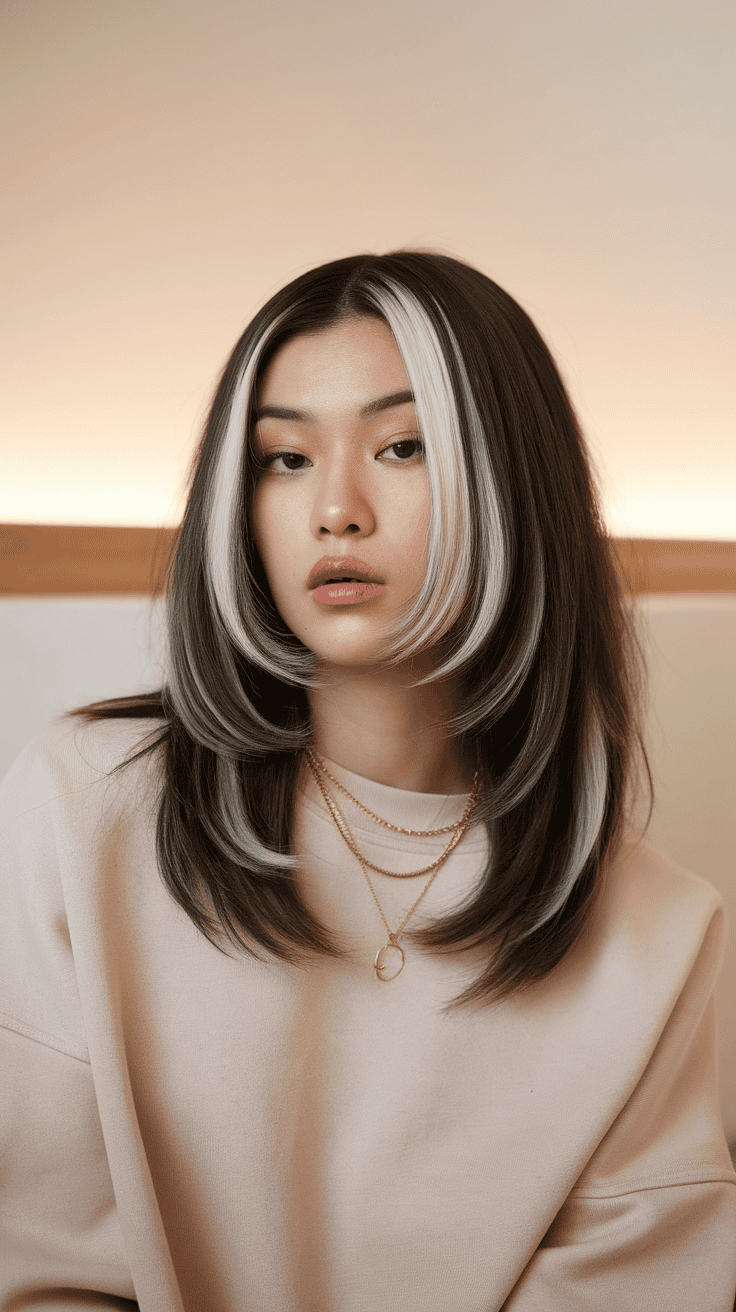 Craving a bold look? Try chunky icy blonde sections on your dark hair. These bright highlights create a cool contrast that really pops.