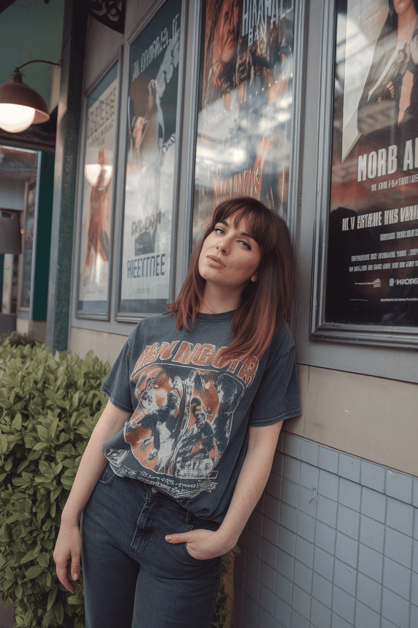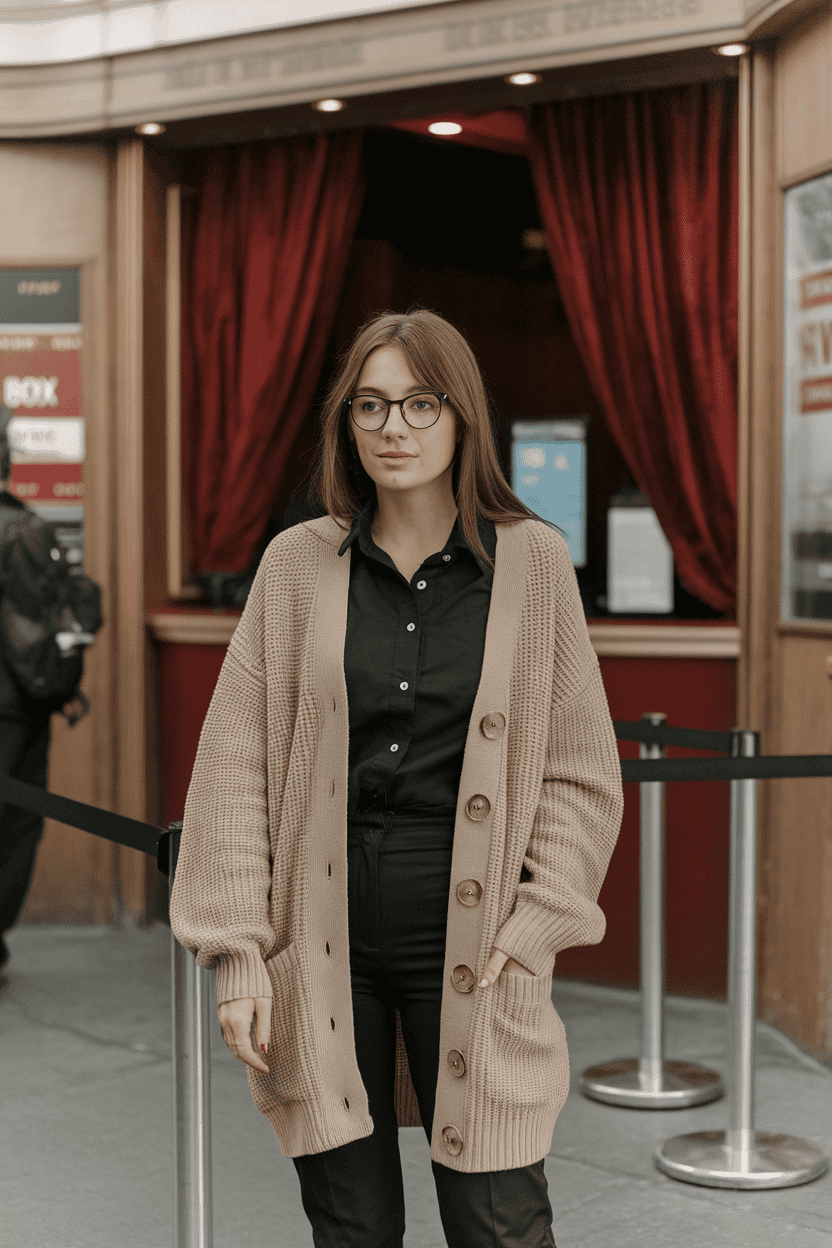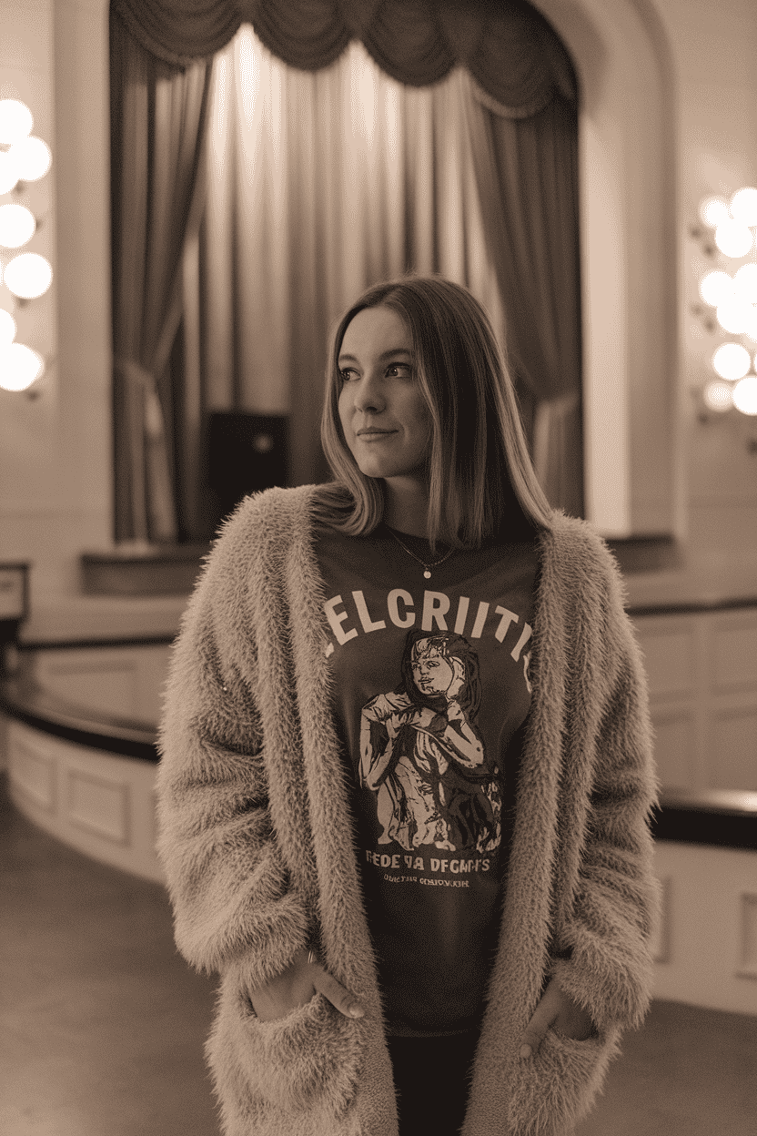 A soft, fluffy cardigan over a graphic tee? That’s comfort and personality in one go. It’s cozy and gives off relaxed energy—exactly what you want for a movie night.