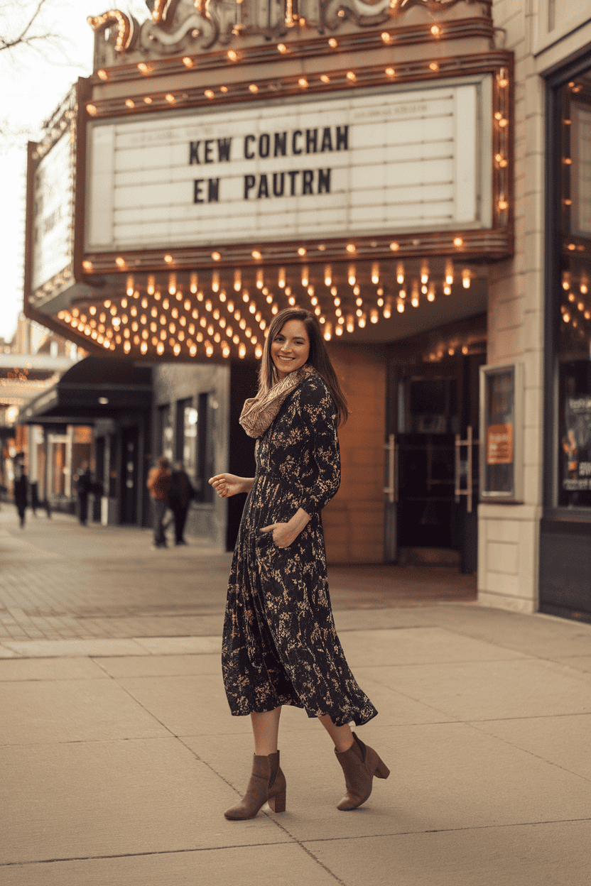 A flowy midi dress and ankle boots just feel right for a movie date. The dress gives you that soft, feminine look, and the boots bring a bit of edge.