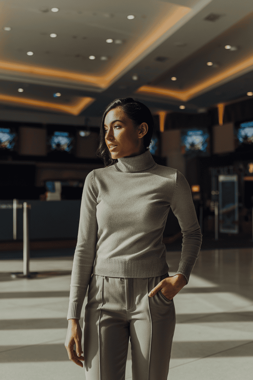 Try a soft knit turtleneck for that cozy, low-key look. Slim pants keep it sleek and unfussy.