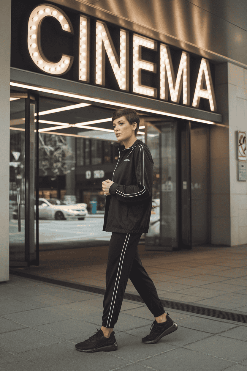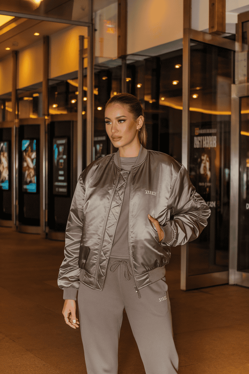 Try a sleek bomber jacket with jogger sweats for a comfy yet stylish movie date outfit. It’s relaxed but still looks intentional.