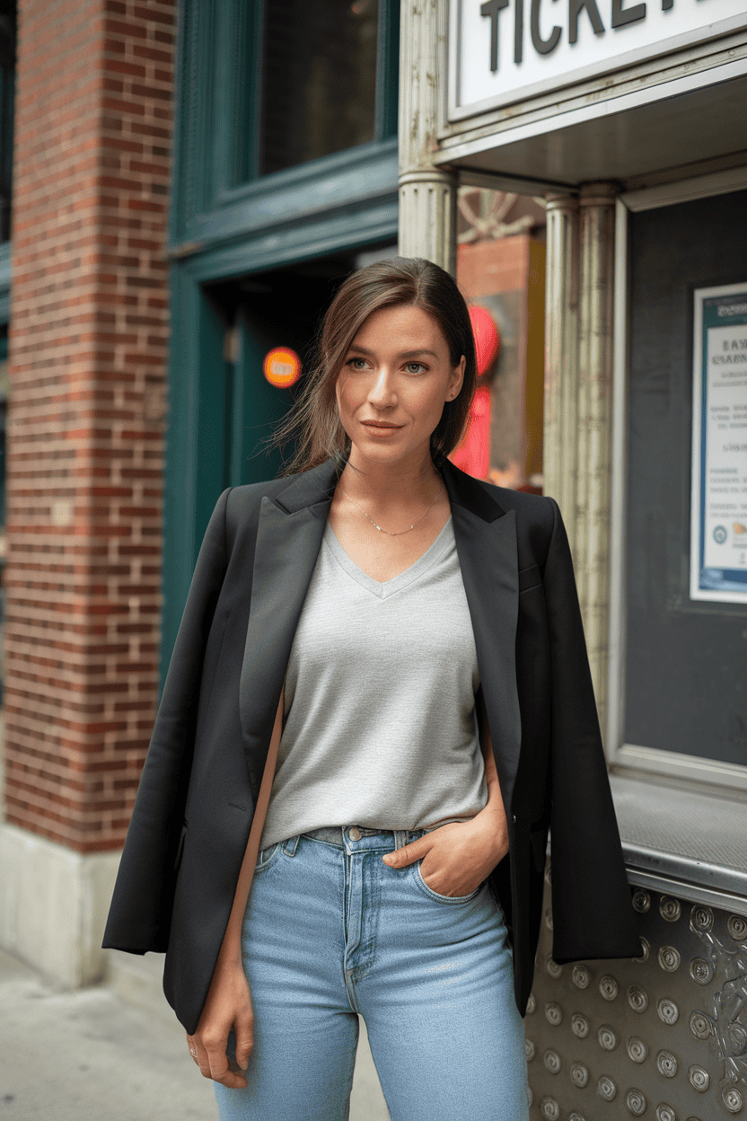 A blazer over a plain v-neck tee just works. It’s put-together, but you don’t look like you’re trying too hard.