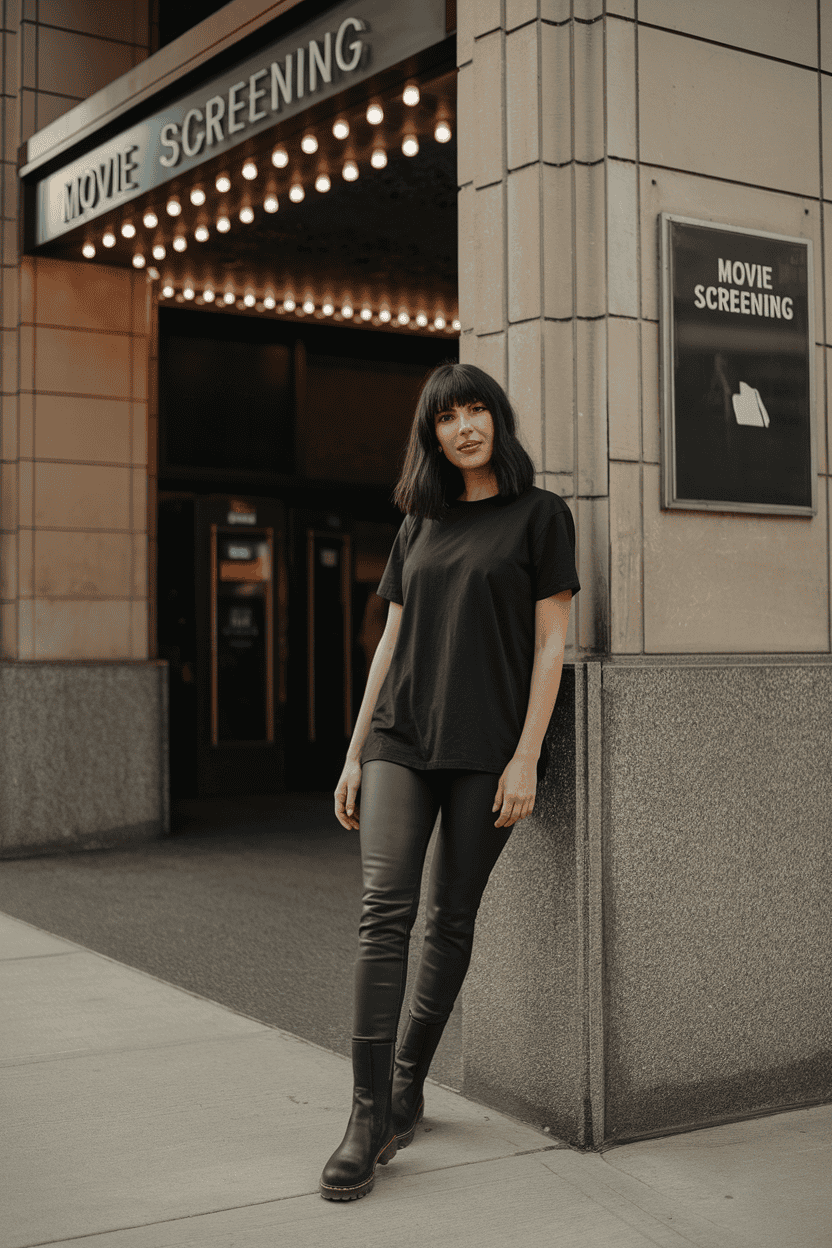 A basic black tee and leather leggings just work for movie dates. This combo is comfy and easy, but still has a bit of cool factor.
