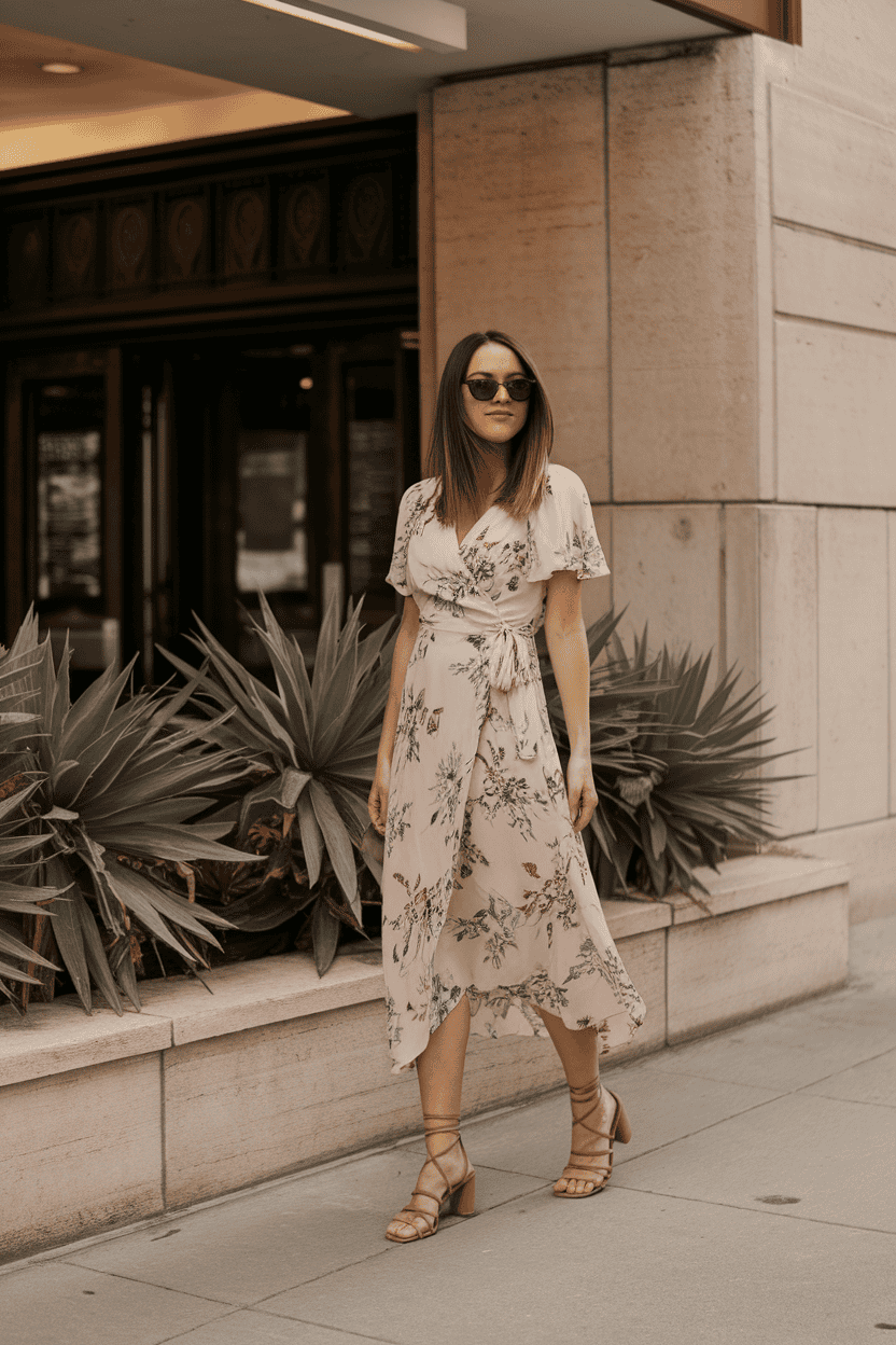 A floral wrap dress feels perfect for a movie date—comfortable and fresh, no fuss needed. Pair it with strappy sandals to keep things light and a little stylish.