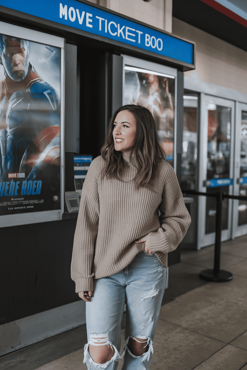 Honestly, a cozy pullover and ripped boyfriend jeans never fail for movie nights. The pullover keeps you warm without feeling bulky.