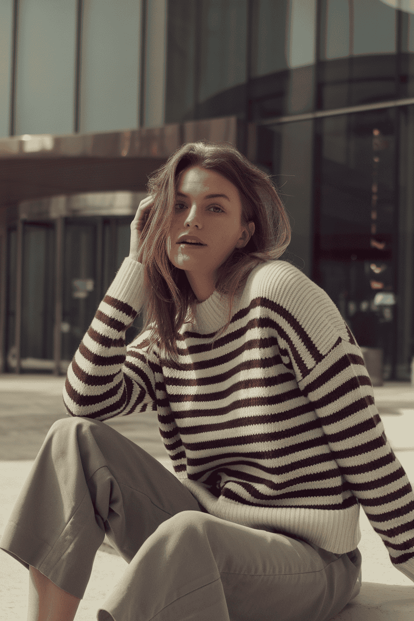 Want something comfy but a little more polished? Try a striped sweater with tapered pants. The stripes add style without being loud.