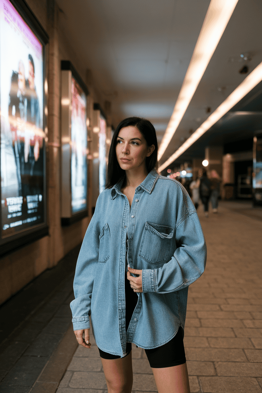 Pair an oversized denim shirt with biker shorts for a cool, comfy movie date outfit. It’s relaxed and a little trendy without much effort.