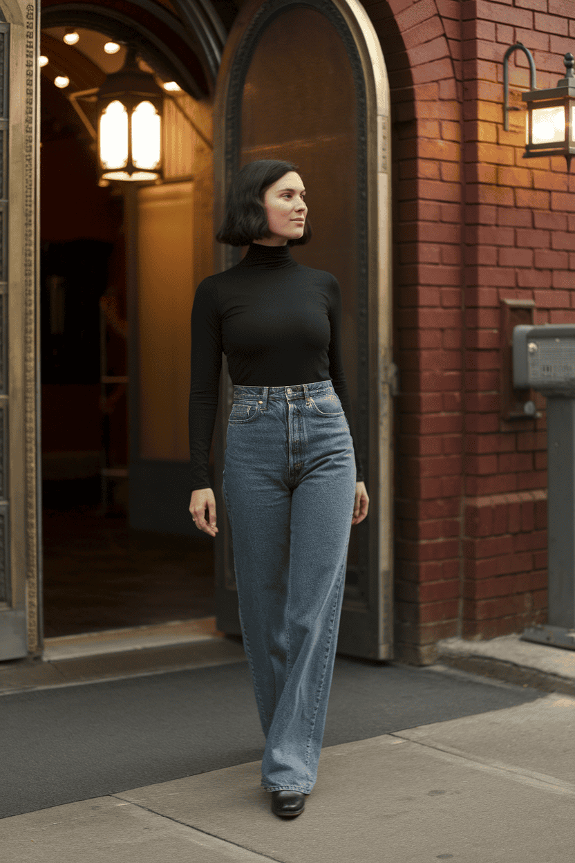 A black turtleneck and high-waisted jeans—classic, right? This combo is simple but stylish, perfect when you want to look put together without making a big deal.